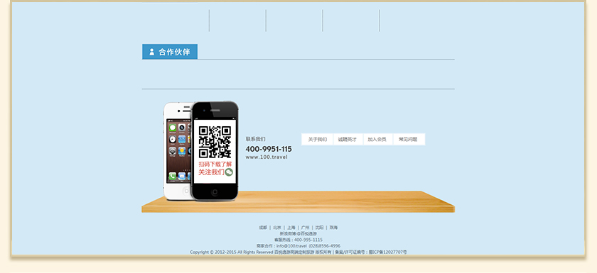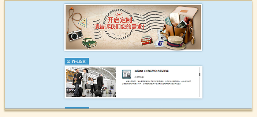 Project Description 百悦逸游于2012年初由二位资深的旅行家创办,是成都传媒集团旗下成都新闻国际旅行社有限公司的高端旅游品牌,总部位于成都高新区天府大道中段美年广场。在百悦逸游成立之前,创始团队亲自到全球三十多个国家实地考察,带着第一手的资讯和执着的信念创立了中国西部第一家真正意义上的私人定制旅行机构。百悦的旅行不是跟团挤大巴,不是十天去十个国家,更不是没完没了的... Official website address 铜陵http://www.100.travel I want to share